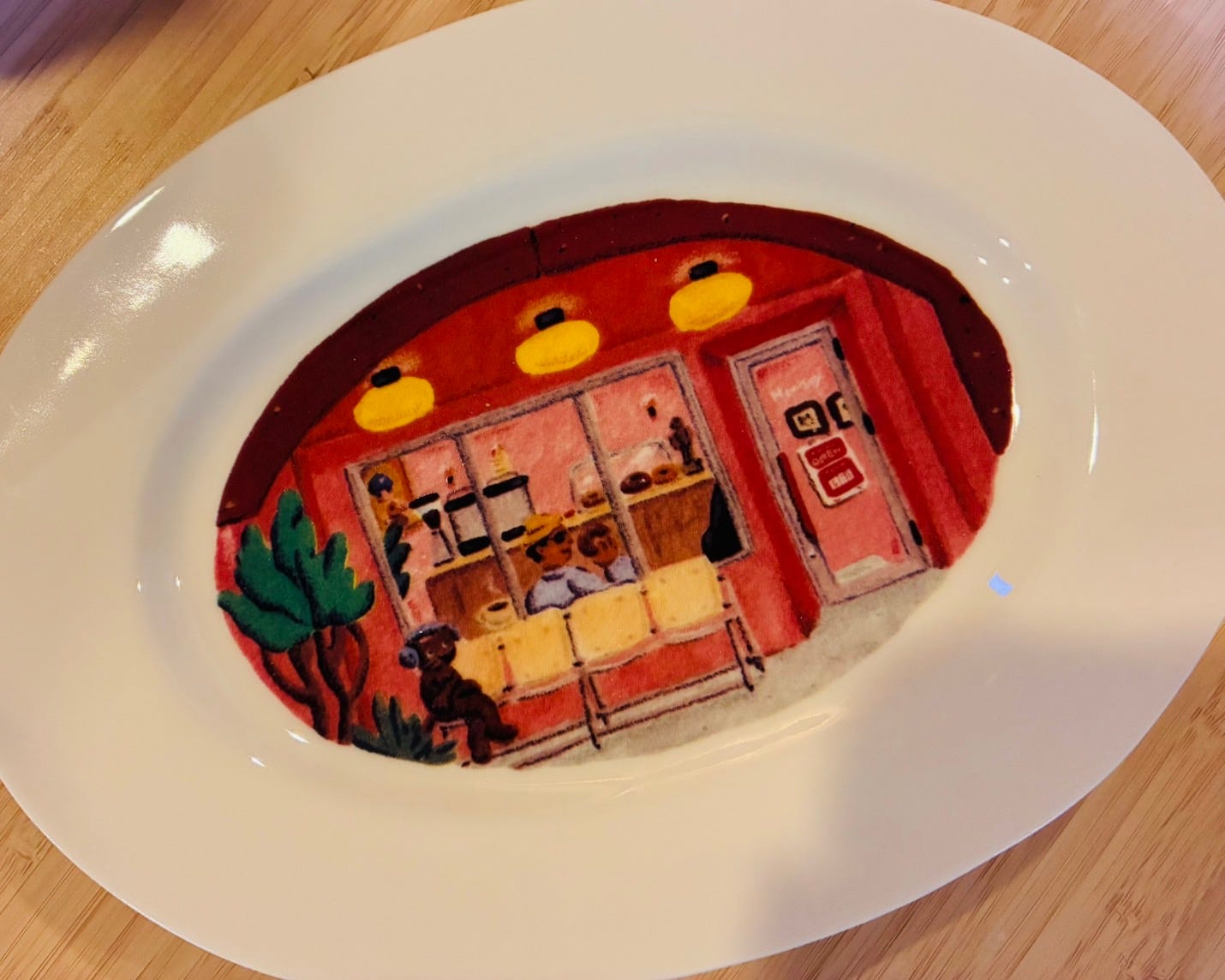 イラストレーターのTomo Oriyama さんの描き下ろし絵がプリントされたバンダナとお皿。アート作品のようです。